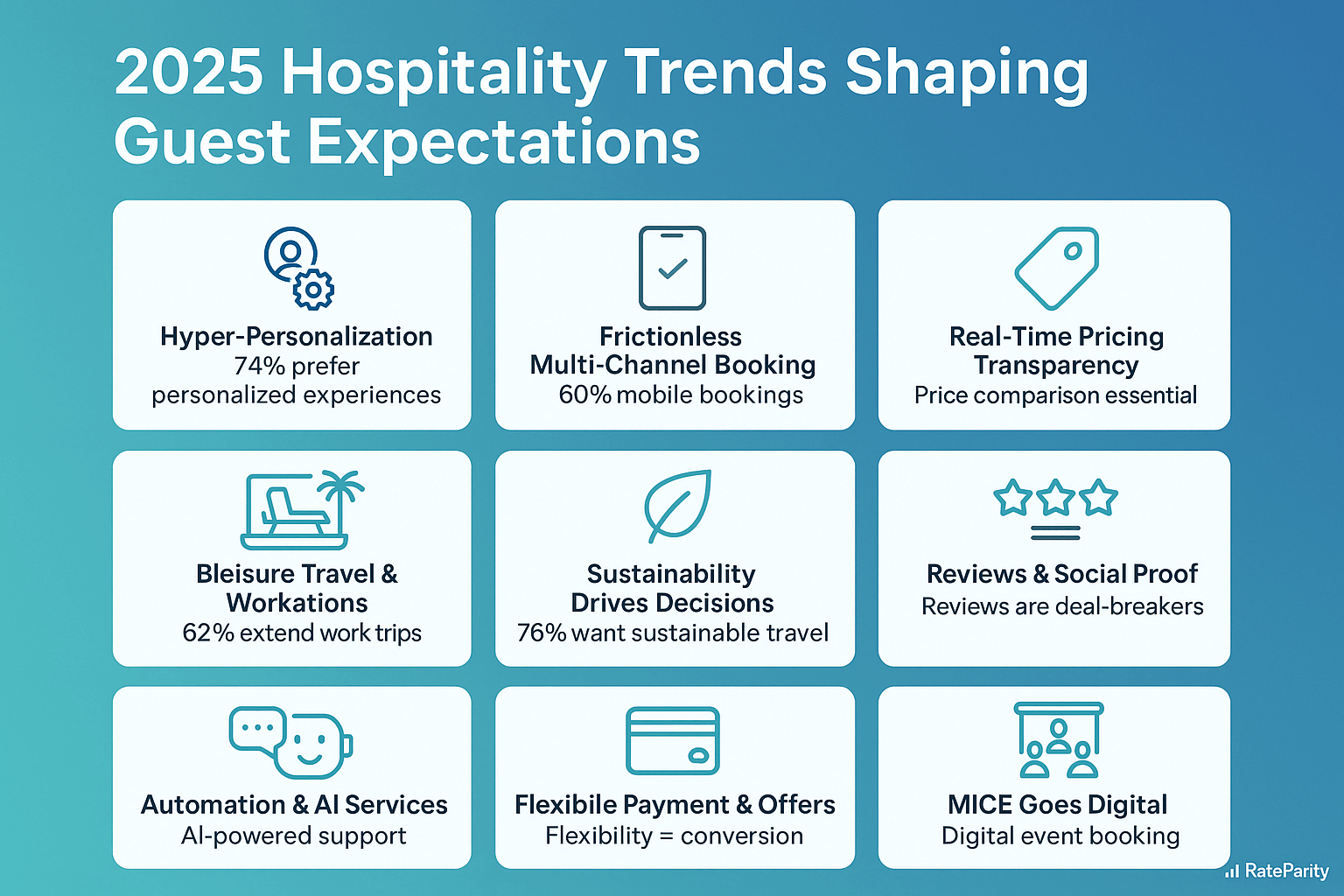 This article explores the key hospitality trends shaping guest behavior, booking preferences, and service expectations in 2025 — and what hotels can do to meet (and exceed) them.