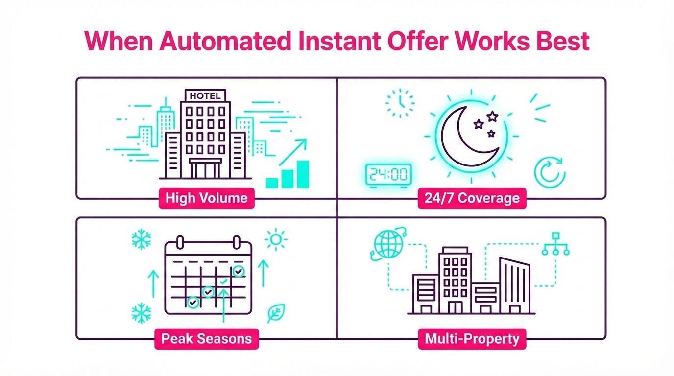 - Seasonal or Event-Driven Demand: During peak inquiry periods (holidays, conferences, local events), quote volume spikes dramatically. Automated Instant Offer scales instantly without additional staffing.