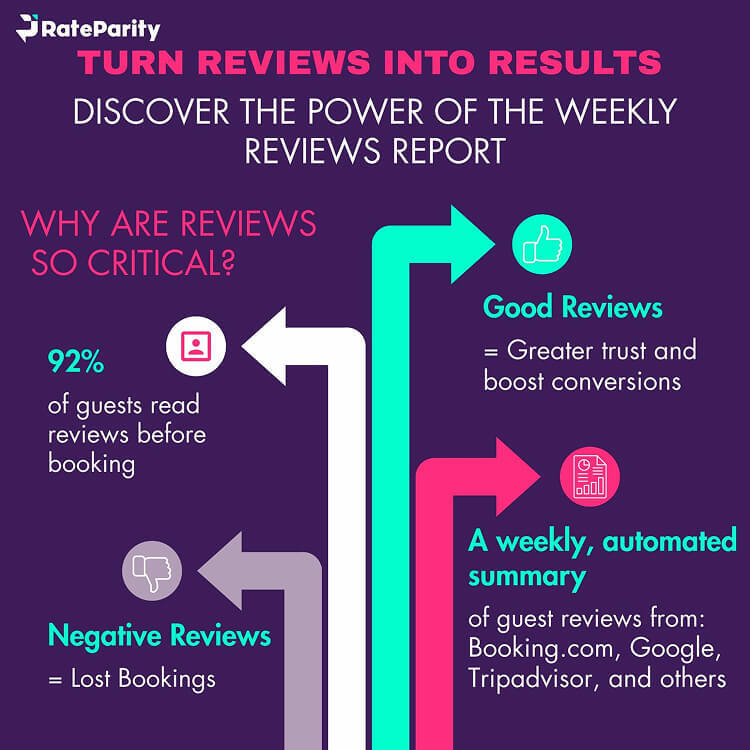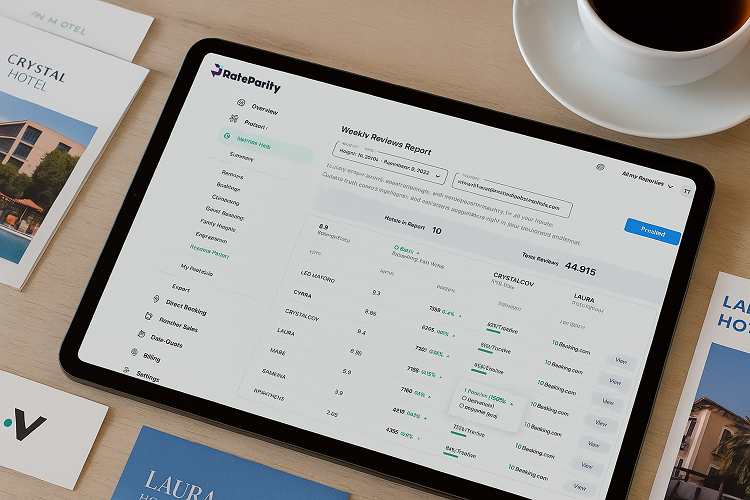 That’s why RateParity created the Weekly Reviews Report: a comprehensive, easy-to-read summary of your hotel’s latest guest feedback from Booking.com, Tripadvisor, Google, and other major sources. Delivered straight to your inbox and available via the dashboard, this tool ensures you’re always in tune with guest sentiment without needing to dig for data.