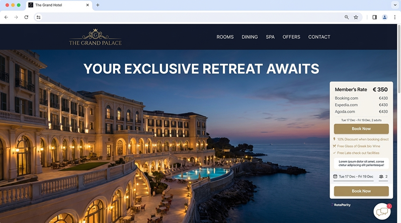 For hotels that prefer a more embedded approach, RateParity now offers an alternative to the Super Widget: a price comparison banner displayed directly inside the booking engine. The banner highlights your hotel’s direct rate alongside OTA prices and showcases direct booking benefits – all within the booking engine environment.