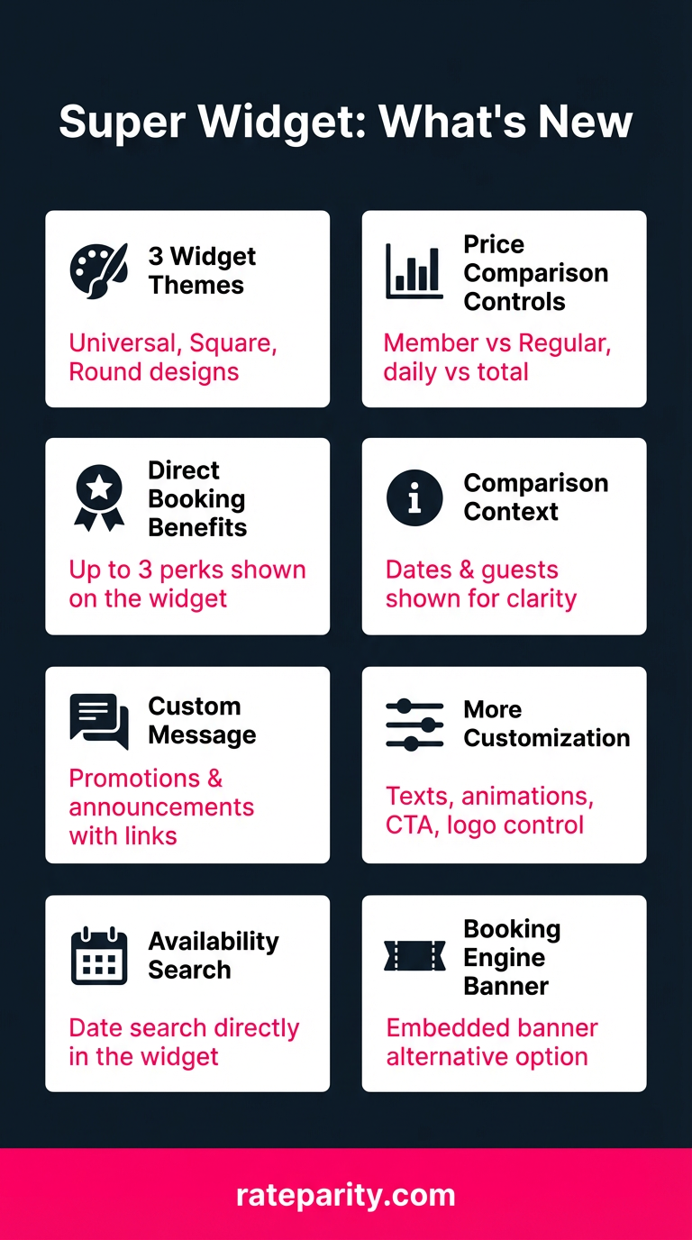 Your hotel’s booking widget just got a major upgrade. RateParity has rolled out a powerful set of new features for the Super Widget – giving hoteliers greater control over design, messaging, pricing transparency, and guest experience. Here’s a full breakdown of everything that’s new.